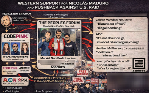 Within hours of the Trump administration’s surprise extraction operation in Venezuela, commentary surrounding President Nicolás Maduro’s arrest for alleged narco-state conspiracies metastasized into something Trump’s war cabinet could not control with stealth helicopters, radar jamming, or the world’s most effective special forces units: a narrative war in support of Maduro, waged at internet speed by organizations that already had templates, coalitions, and street logistics in place — and that have demonstrated well-oiled campaigns in support of causes such as Hamas, the Iranian regime, and China’s geopolitical aims in recent years.