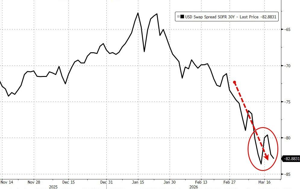 Swap spreads (another arcane signal of potential stress in the market’s funding channels), are pushing notably wider…