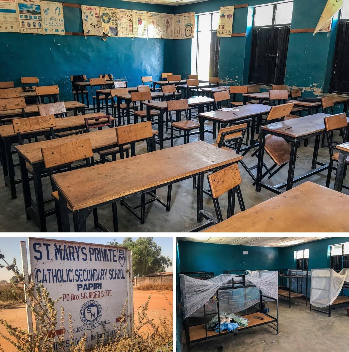 (Top) A general view of a classroom at St. Mary’s Catholic School in Papiri, Agwarra local government, Niger state, Nigeria, on Nov. 23, 2025. (Bottom L) A signboard for St Mary’s Private Catholic Secondary School stands at the entrance of the school in Papiri, Agwarra local government, Niger state, Nigeria, on Nov. 23, 2025. (Bottom R) A general view of empty bunk beds and scattered belongings inside a student dormitory at St. Mary’s Catholic School in Papiri, Agwarra local government, Niger state, Nigeria, on Nov. 23, 2025. Ifeanyi Immanuel Bakwenye/AFP via Getty Images