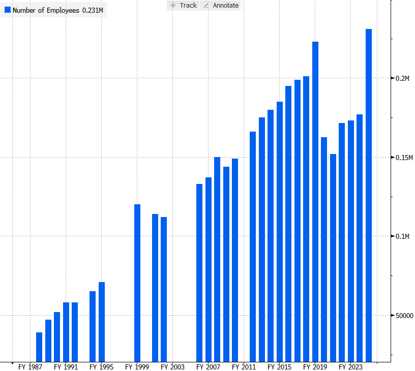 The latest Bloomberg data shows Disney’s overall workforce consists of 231,000 full- and part-time employees.