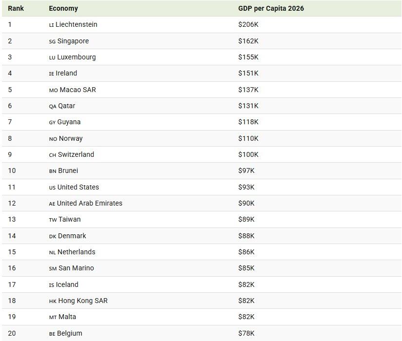 Energy-rich nations like Qatar and Brunei also appear near the top. The United States ranks 11th at roughly $93,000 per person, while European countries account for a majority of the top 20.