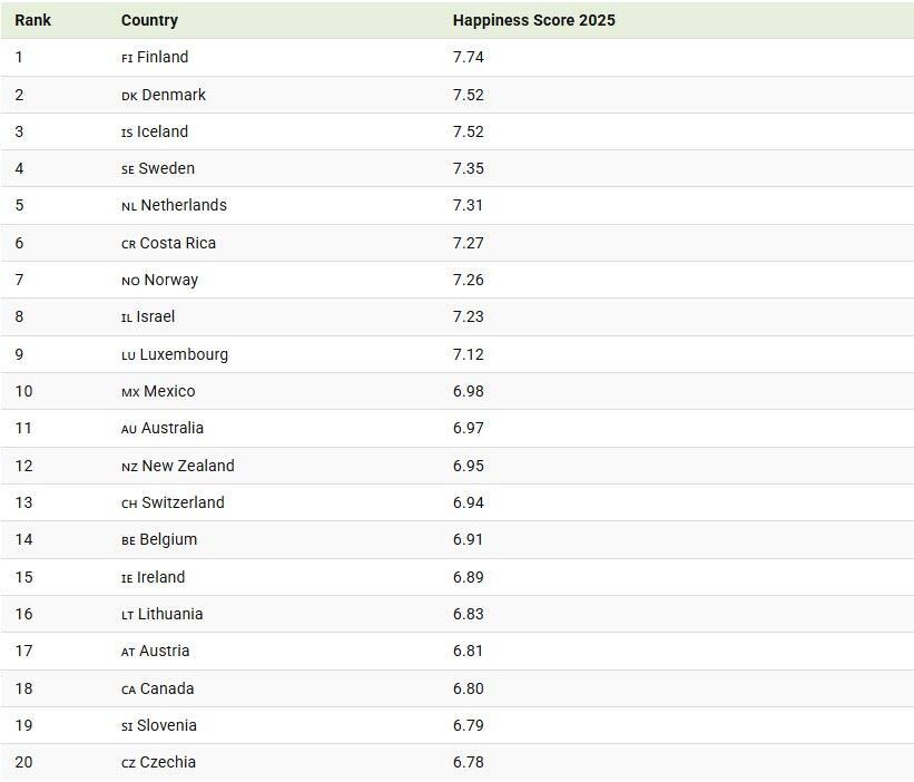 Meanwhile, some of the world’s richest economies, such as Singapore and Qatar, do not appear among the top 20 happiest countries.