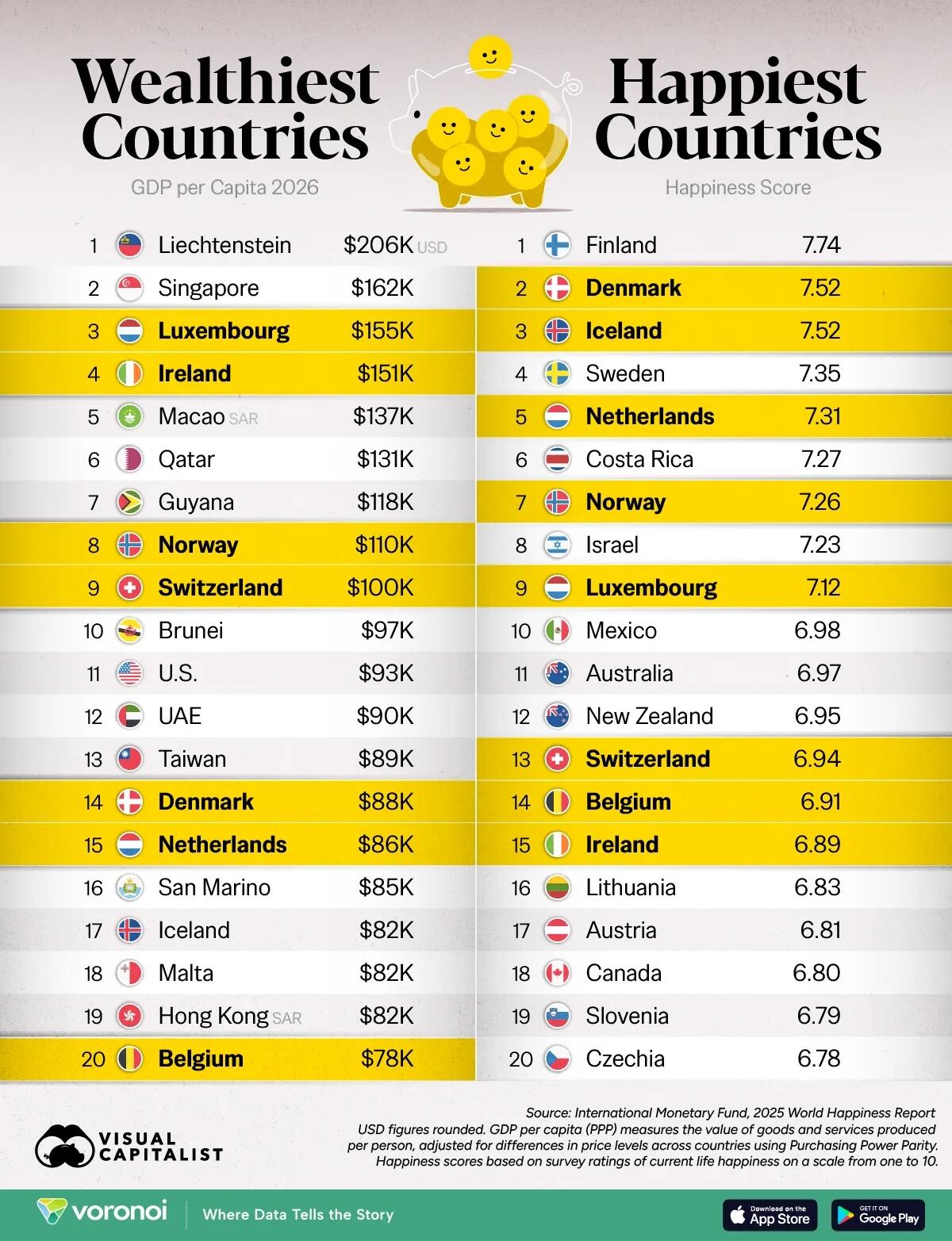 Only a handful of countries rank near the top on both wealth and happiness—making them rare global outliers. Denmark, Iceland, Norway, Luxembourg, Switzerland, Ireland, and the Netherlands stand out as rare examples where high incomes coincide with high life satisfaction.