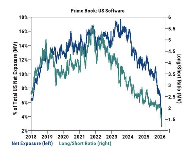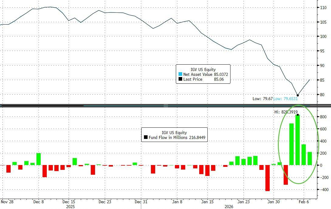 1M rolling net retail inflows into the iShares Software ETF (IGV) surged to a record $176mn as of close yesterday, more than double the prior peak seen during the late-2024 software drawdown.