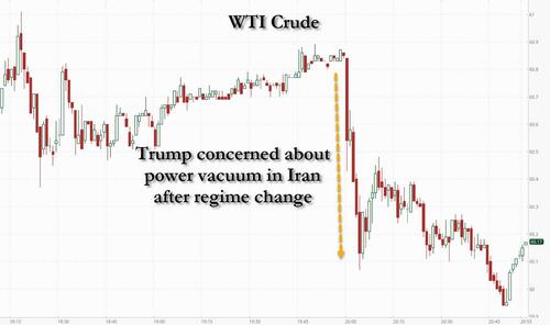 Trump’s comments to Reuters and the NBC report have effectively eliminated the probability of an imminent action, and as a result crude oil, which was rising again on geopolitical fears, tumbled with WTI set to dip below $60 after trading above it all day…