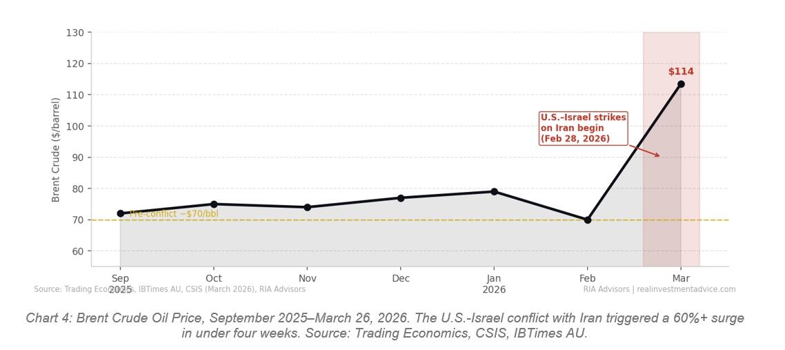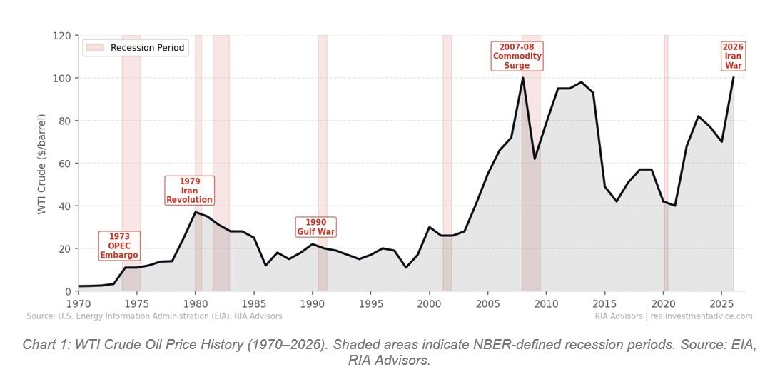 After more than three decades of watching oil markets upend economies, one pattern keeps repeating: investors learn the wrong lessons from the last shock. The 1973 OPEC embargo taught us that geopolitical disruptions are temporary. That lesson then got everyone killed, financially speaking, in 1979. The 2003 Iraq War produced only a mild oil bump and no recession, so traders got comfortable. Then 2008 happened. Today, with Brent crude having spiked over 60% since U.S. and Israeli strikes on Iran began in late February, the same dangerous reasoning is circulating again. That narrative is that this “event” is manageable and will resolve quickly. If that is the case, then the economy will absorb it.