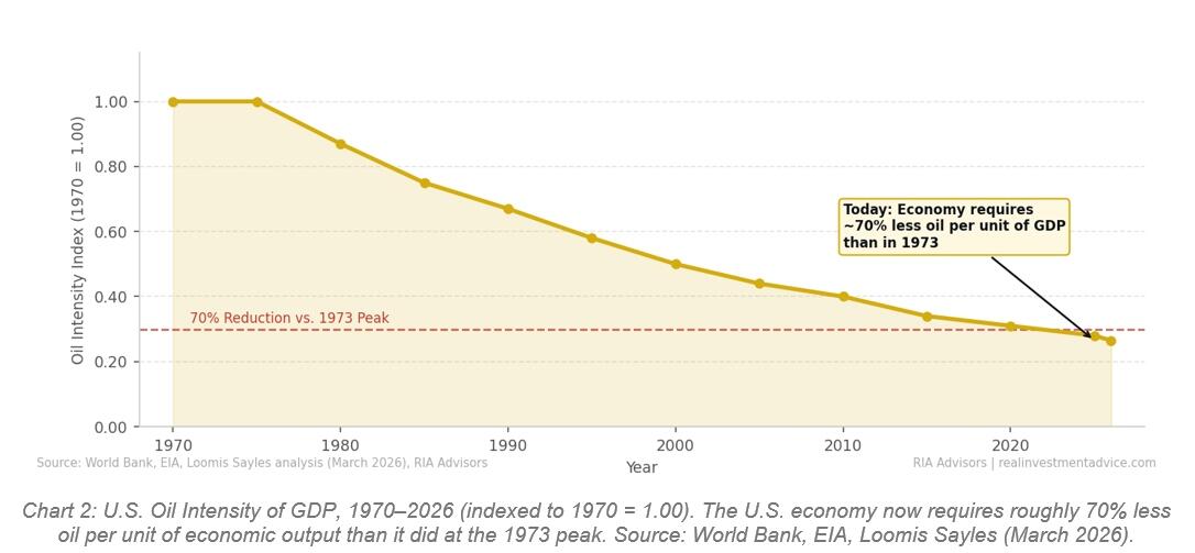 The U.S. oil intensity of GDP has fallen roughly 70% since 1973.
