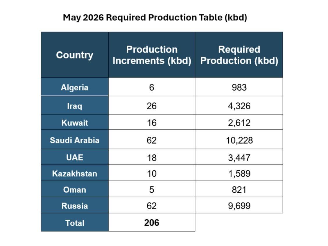 Rhetoric aside, the oil producers led by Saudi Arabia and Russia agreed to increase targets for May by about 206,000 barrels a day during today’s video conference. The modest rise that will largely exist on paper as its key members are unable to raise production due to the U.S.-Israeli war with Iran. Saudi Arabia and Russia saw the biggest output increases, 62 kbpd each.
