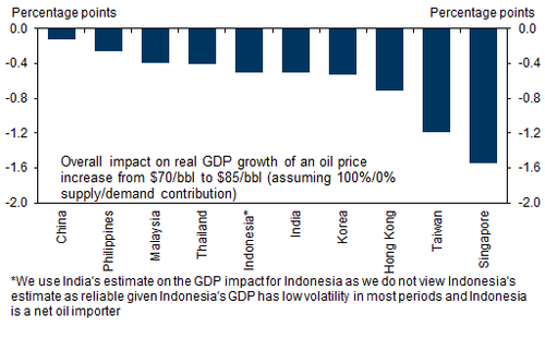 Conversely, Singapore, followed by Taiwan and Korea, will bear the brunt of it with a -1.6% hit to GDP growth and this is only assuming $85 oil. Brent has now crossed the $100 handle with risks to the upside.