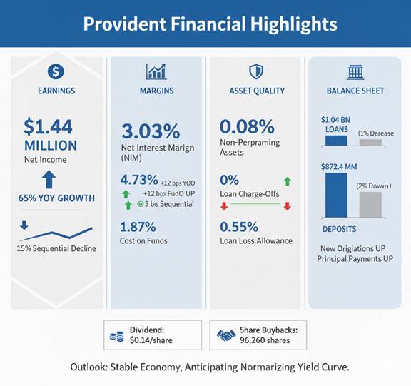 Provident Financial continues to execute a capital return strategy, repurchasing 96,260 shares of common stock during the quarter at an average price of $13.78 per share. The board also maintained its quarterly cash dividend of $0.14 per share.