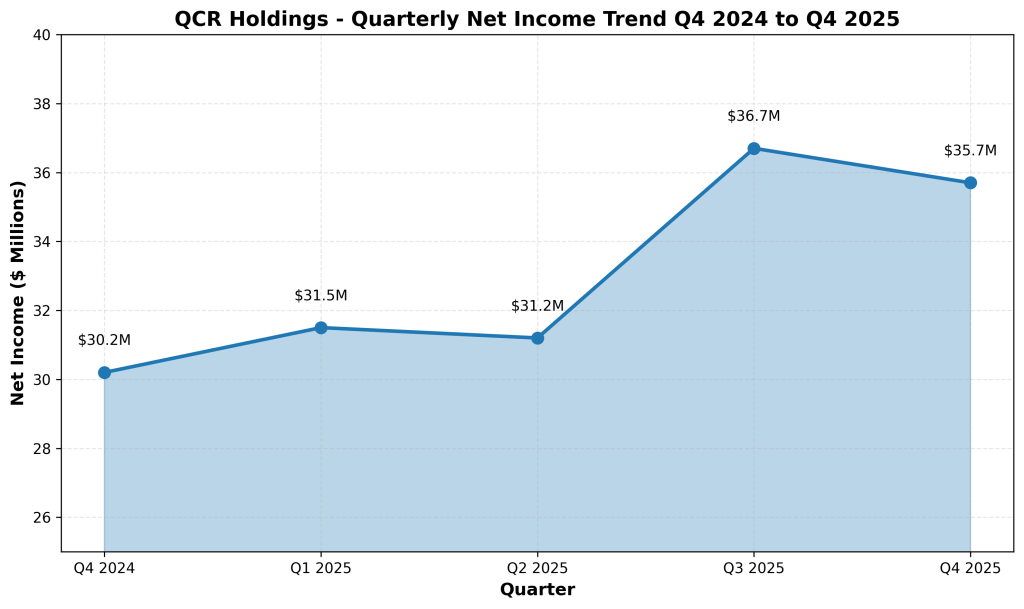 QCR Holdings reported fourth quarter 2025 net income of $35.7 million, compared to net income of $36.7 million in the third quarter and $30.2 million in the fourth quarter of 2024. Adjusted net income for the fourth quarter totaled $37.3 million, compared to $36.9 million in Q3 2025 and $32.8 million in Q4 2024.
