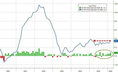 After a hotter than expected print in January, US Producer Prices were expected to continue to rise (but only modestly) in February data released today. The consensus direction was right but the scale was way off as headline PPI accelerated 0.7% MoM (vs +0.3% exp and +0.5% prior) – the biggest monthly jump since July 2025.