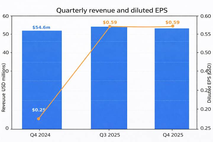 Shares closed flat at $21.57. Q4 net income was $10.2 million with diluted EPS of $0.59.