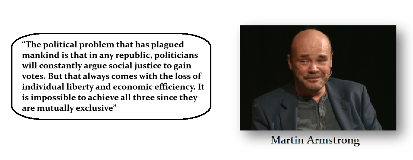 COMMENT: Marty, all I can say is WOW! I have a PhD in economics. You drop bombshells here and there that are so profound they are beyond everything ever taught in economics. Your comment that social justice is incompatible with economic efficiency and individual liberty is right in front of our eyes. Nobody has ever laid Marxism and Keynesianism out to rest in so few words. I would wage a bet it will take just weeks before someone claims this was their idea when what is obvious is that to reach such a profound statement necessitates actual observation and experience. Nobody has that experience but you since you have dealt with governments around the world and major institutional investors. That statement sums up decades of false theories in economics that have suppressed society and is leading to war.