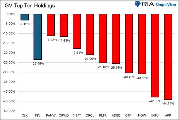 The first analysis compares the software ETF IGV to the broad technology sector ETF XLK. Within the top ten holdings of XLK, Microsoft and Palantir are the only two that are also in the top ten holdings of IGV.