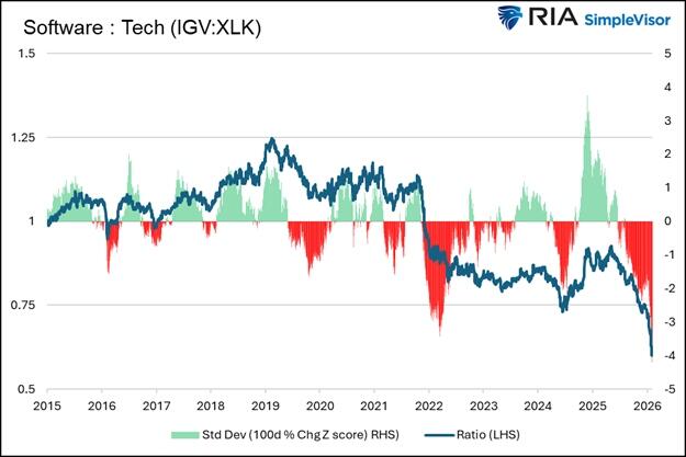 In this article, we address one such divergence between the broad technology sector and the software-as-a-service (SaaS) sub-industry. The graph below shows the wide gap in returns between software, technology, the Nasdaq 100, and semiconductor stocks. Since the well-followed software ETF (IGV) peaked on September 19, 2025, it has fallen 30%. For context, the broad technology indexes (XLK and QQQ) are flat over the period, and the semiconductor ETF (SMH) is up 30%.