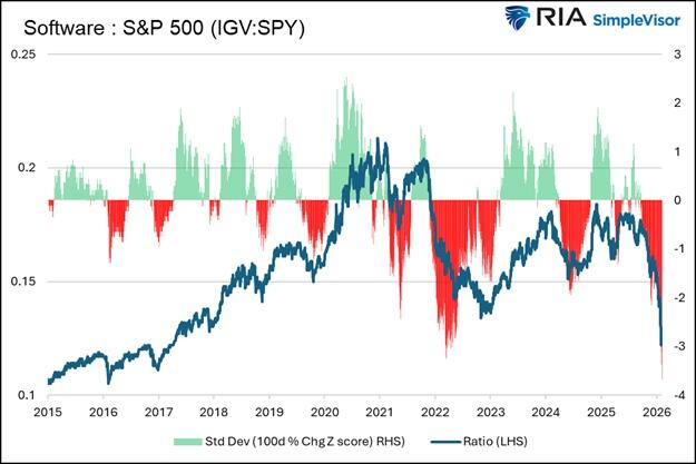 We caution that market rotations have been volatile, with many relationships, like those shown earlier, statistically very stretched. While that may provide comfort for some, we are also aware that in markets like this, where narratives are as strong as they are, relationships can become even more divergent. If you are inclined to buy into the software sector, we recommend taking small starter positions with a stop-loss level in mind. This way, if you are early, the losses are minimal. If the rotations start favoring software stocks and the narrative fades, such evidence may warrant increasing the starter positions. Trade with caution.