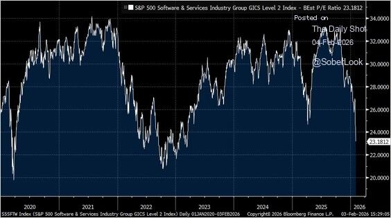 For fundamental context, we share the graph below from the Daily Shot. The P/E ratio of the software sector has fallen rapidly over the last few months, from 34 to 24. For context, the utility sector has a P/E ratio of 21.