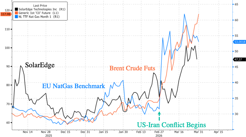 SolarEdge shares are up 64% year to date, broadly tracking Brent crude and the European natural gas benchmark. The logic behind the trade is that higher fossil fuel prices improve the economics of alternative energy.