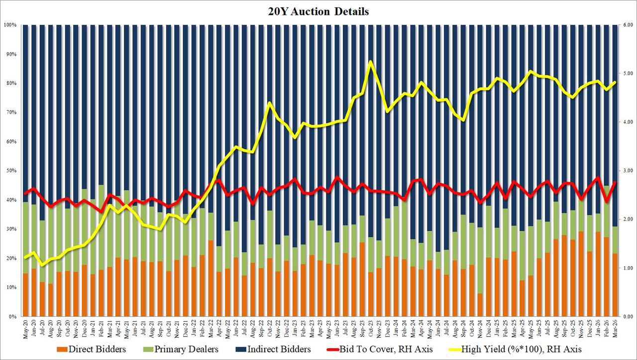 Internals were especially strong, with Foreign demand surging from just 55.2% in February, to 69.2% in March, the highest Indirect award since April 2025 (and obviously above the recent average of 62.1%). And with Directs taking down 21.6%, below the six-auction average of 27.0%, Dealers were left holding 9.2%, a big drop from 17.6% in February and one of the lowest Dealer allotments on record.