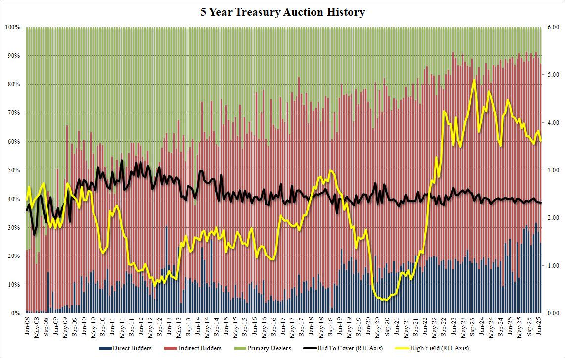 The auction priced at a high yield of 3.615%, down from 3.823% a month ago, and the lowest since November; it also tailed the When Issued 3.608% by 0.7bps, the biggest tail since last July.