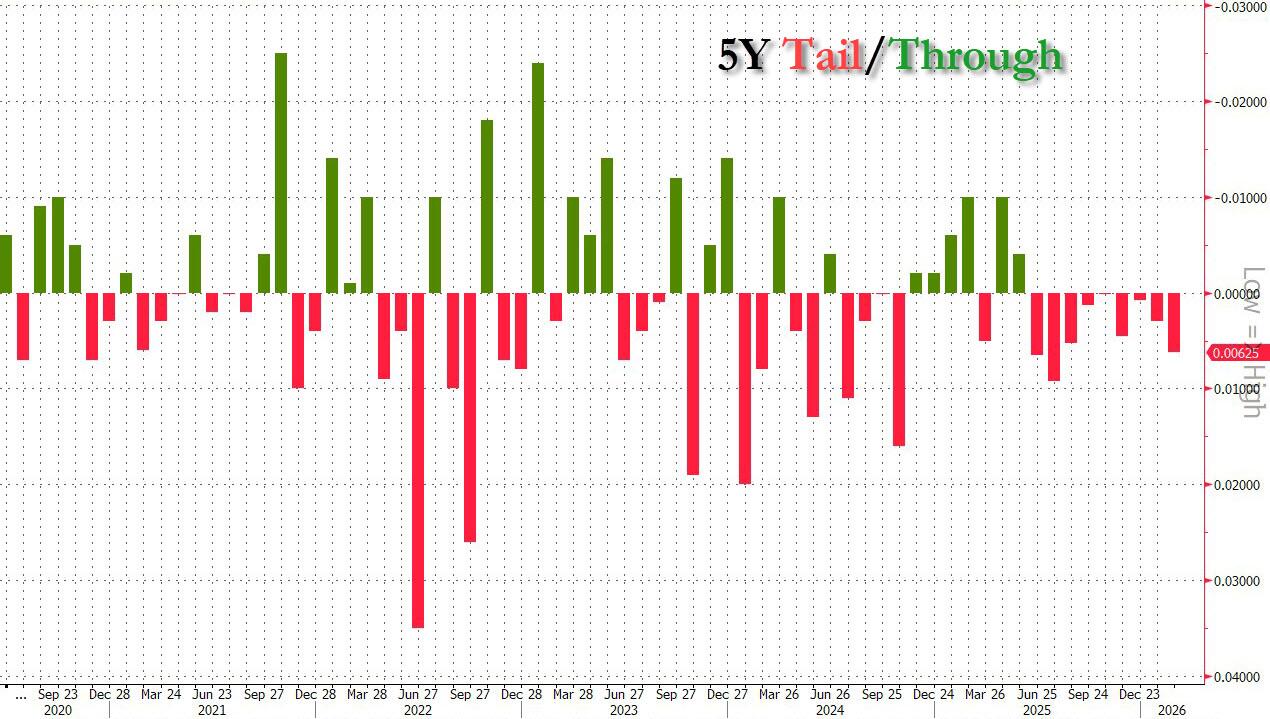 Subpar 5Y Auction Sees Biggest Tail Since July 2025, Bid to Cover Slides