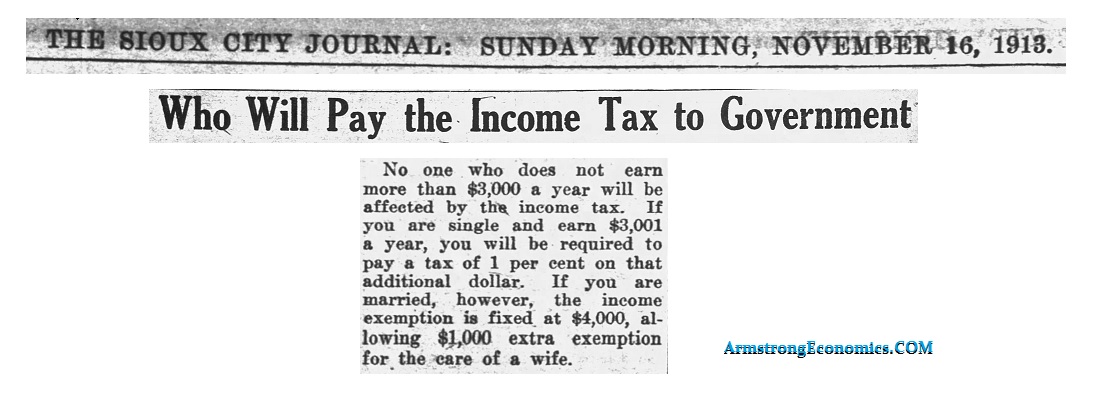 They also have constantly changed the top tax rate. During World War II it stood at $5 million. Then it came down to $250,000. But it got worse. When the modern income tax was established by the 16th Amendment in 1913, it taxed individuals on their own income. There was no concept of a joint return for married couples.