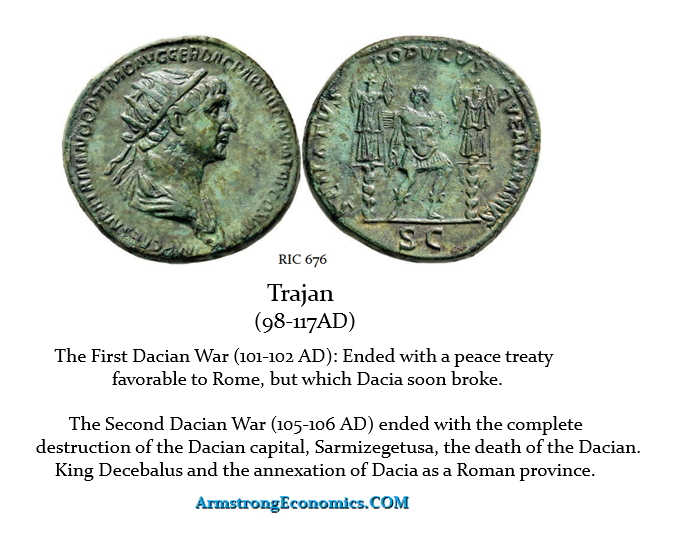 ANSWER: I guess you have been digging into ancient history. Yes, in fact, the Roman Emperor Trajan (98-117AD) even issued a coin showing him standing between two trophies representing the first Dacian War which ended in a peace treaty, which they then broke, and he launch a second campaign against them representing the second trophy.