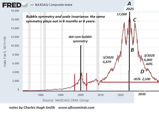 But self-liquidating systems are not permanent. Their internal dynamics guarantee the end-game is extinguishment. Here is a projection of the Everything Bubble based on bubble symmetry and scale invariance: what goes up will come down on a similar trajectory.
