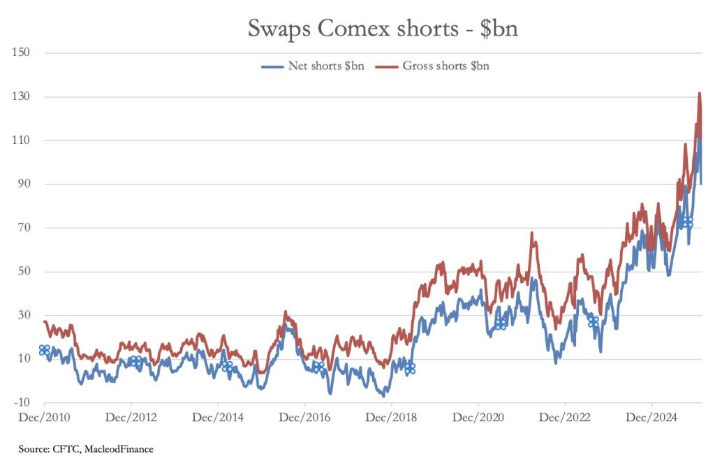 The falling settlement numbers in London from 44 million to 17 million, while the value of the settlement rose 4.5 times, illustrates the problem paper markets now face. On Comex, which has the same problem, this is demonstrated by the gross and net short position of the Swaps category, which is comprised mainly of bullion bank traders: