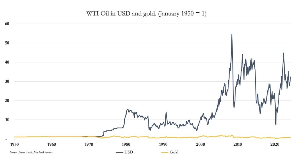To illustrate this importance, the chart below shows average values for a range of industrial metals priced in dollars and gold, followed by a chart of oil similarly priced.