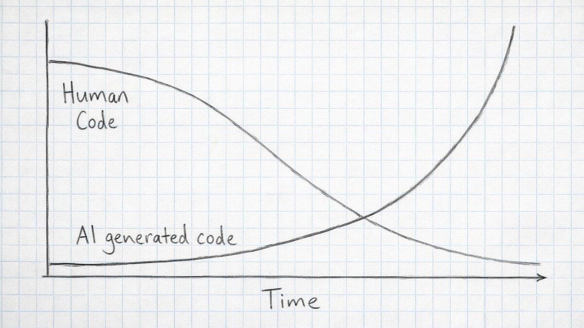 A year ago I posited that the ratio of human coded lines of software to AI code would quickly go into exponential decay: