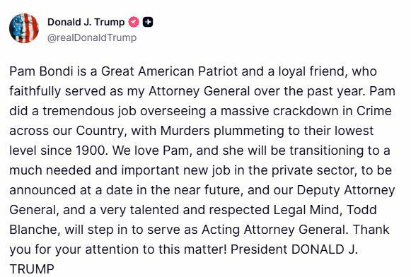 In a Thursday statement, Trump called Bondi “a Great American Patriot and a loyal friend, who faithfully served as my Attorney General over the past year,” adding “she will be transitioning to a much needed and important new job in the private sector, to be announced at a date in the near future, and our Deputy Attorney General, and a very talented and respected Legal Mind, Todd Blanche, will step in to serve as Acting Attorney General.“