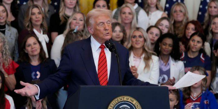 President Donald Trump speaks before signing an executive order barring transgender female athletes from competing in women’s or girls’ sporting events, in the East Room of the White House, Wednesday, Feb. 5, 2025, in Washington. (AP Photo/Alex Brandon)