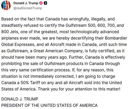 “We are hereby decertifying their Bombardier Global Expresses, and all Aircraft made in Canada,” Trump wrote on Truth Social, warning that if the dispute is not “immediately corrected,” Washington would impose a “50% Tariff on any and all Aircraft sold into the United States of America.“