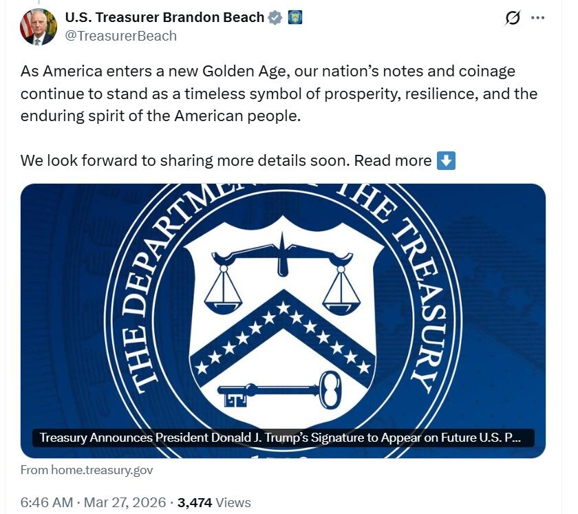It will put both Trump and Treasury Secretary Scott Bessent’s signatures on future US notes.