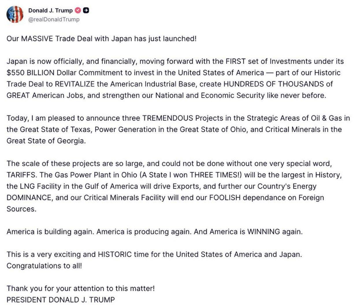 Details of the much anticipated US-Japan trade mega deal have finally been revealed. First, Trump previewed in a Truth Social post on Tuesday: “Our MASSIVE Trade Deal with Japan has just launched!” He then boasted that “The scale of these projects are so large, and could not be done without one very special word, TARIFFS.”