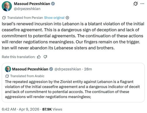 There’s some optimism regarding the US-Iran ceasefire holding, as it’s been relatively quiet in the Middle East overnight into Thursday, despite Israel getting some final shots on Lebanon in. On this, Iran’s president has made clear Tehran’s position that Israel’s renewed incursion into Lebanon and against Hezbollah violates the ceasefire, warning that these actions could make talks moot before they even begin.
