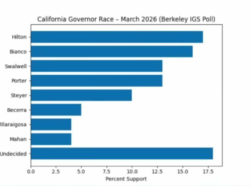 The most recent Berkeley IGS Poll, conducted March 9–15, 2026, showed Hilton leading with 17 percent support among likely voters, followed closely by Bianco at 16 percent. Among Democrats, the deeply unpopular and controversial Rep. Eric Swalwell and former Rep. Katie Porter were tied at 13 percent, with left-wing billionaire Tom Steyer lagging at 10 percent.