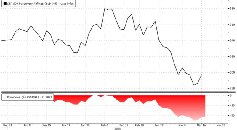 The S&P 500 Passenger Airlines Index has tumbled into a bear market since Operation Epic Fury unleashed flight disruptions across the Middle East and sent Jet A fuel prices sharply higher, with Deutsche Bank warning the fuel price shock could become an “existential threat” for the weakest carriers. The key question now is whether the worst of the selloff in US airline stocks is over, with UBS analysts beginning to ask if a bottom is near.
