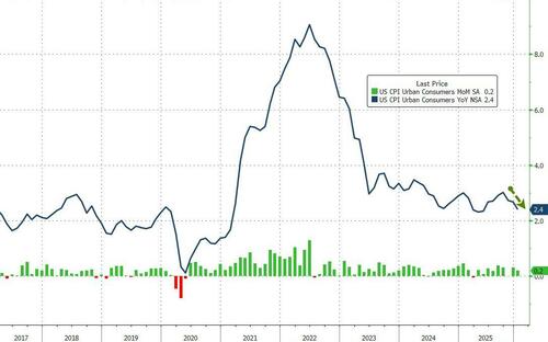 Despite the ‘hot’ whisper numbers (and 4 previous Januarys in a row of upside surprises), headline consumer price inflation came in cooler than expected in January (+0.2% MoM vs +0.3% expected). That pulled the headline CPI down dramatically from +2.7% to +2.4% – near the lowest in 4 years…
