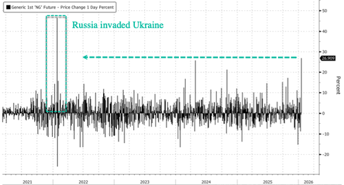As of 09:00 ET, NatGas futures are up nearly 27%, marking the largest intraday jump since Russia’s invasion of Ukraine in late January 2022. The move comes as weather models flipped sharply colder, now forecasting a massive deep freeze across the eastern half of the country through the end of the month.