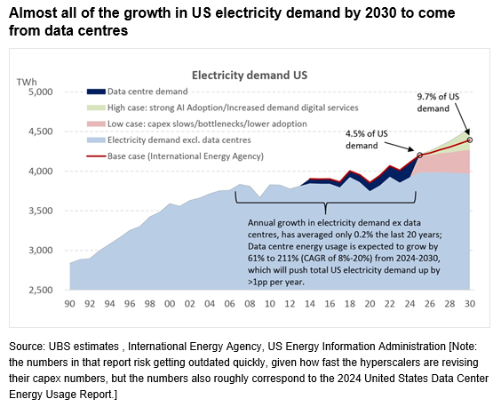 The share of US data centre demand for electricity is set to rise from roughly 4½% to 10% of total US demand (with substantial risks to the upside given the speed of revisions in hyperscaler capex)