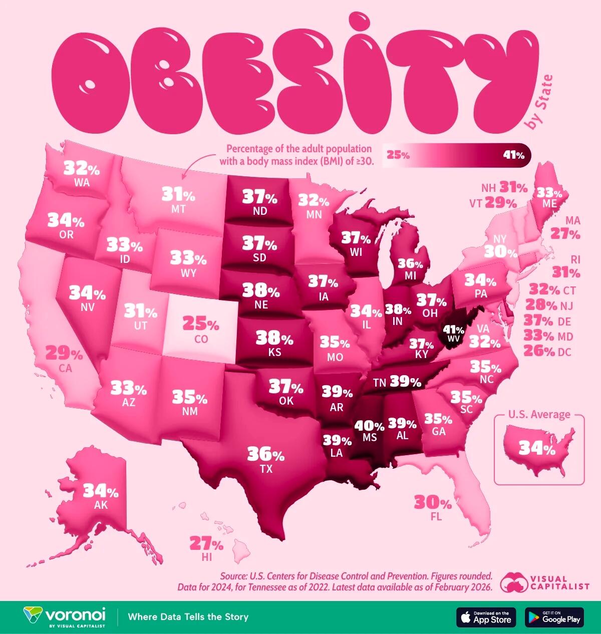 West Virginia tops the list, with 41.4% of adults classified as obese. Mississippi follow at 40.4%, while Alabama, Arkansas, Louisiana, and Tennessee each report rates of roughly 39%.