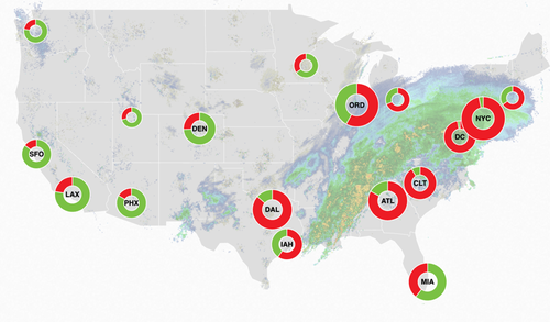 FlightAware’s Misery Map of delays and cancellations shows severe travel disruptions across major airports, from Dallas and Atlanta to Washington, DC, New York City, and Boston.