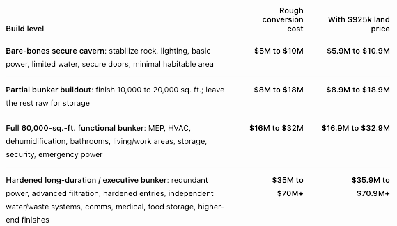 To get it anywhere close to true bunker status, millions of dollars in engineering, ventilation, power, water, wastewater, security, and interior buildout would likely be required.